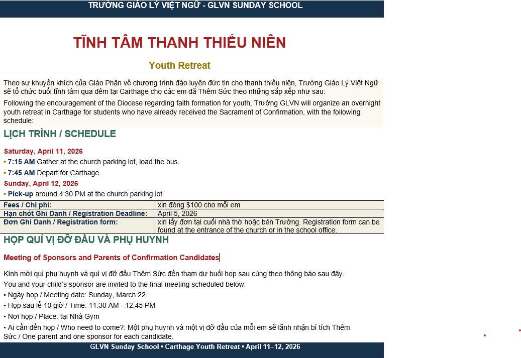 Chúa Nhật / Sunday: 8:30 AM, 10:00 AM & 1:00 PM (No 1pm Mass in June, July & Aug)